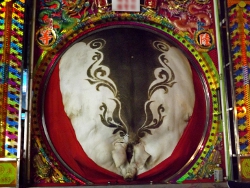 中元普渡慶典上,常可以看到神豬比賽,體重越重的神豬,排名越高,有特等、壹等、貳等、參等 ... 的等級,飼主會將神豬宰殺後,用特殊的棚架將整隻豬架起來,呈現巨大的模樣,口中咬上一顆